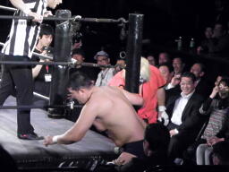 高智ミドルキック連打(右写真)。マーダラーは矢口にタッチ。矢口は大森を呼び込む。