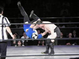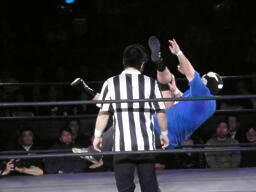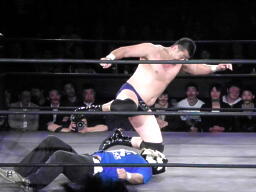 再度ロックアップ、大森ヘッドロック、矢口ロープに振る、大森ショルダーブロック。大森ロープに飛ぶ、矢口のラリアットをかわしビッグブーツ(右写真)。