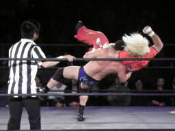 ラリアットをかわしてニールキック(右写真)、大森にタッチ。