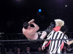 大森はダブルのクローズラインをかわして2人にラリアット(右写真)、高智にタッチ。