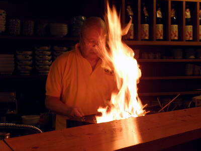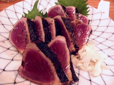 リッチモンドホテルにチェックインし、夕食はいつもの「たたき亭」に。カウンターに座るとわらで焼いてる様子がよく見える。