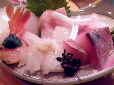 18時30分、腹も減ったのでフロントで食事する店を紹介してもらう。ちょっと遠めだし、初めてのとこなので行きはタクシーで。1000円弱。行ったのは片町の「勝一」。まずは刺身盛り合わせ。ぶり、まぐろ、甘エビ、いか、あら。