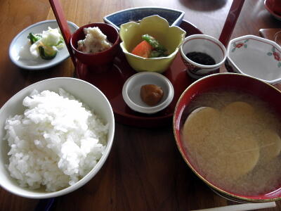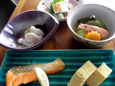 鮭、だし巻き、酢のもの、炊き合わせ、豆腐。野菜自慢のところは朝食がいいね。