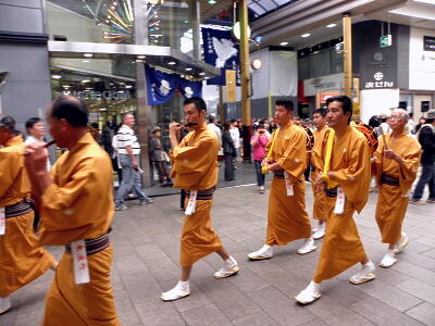 13時過ぎ、アーケードの四つ角にシャギリが姿を見せる。人数揃い開始。