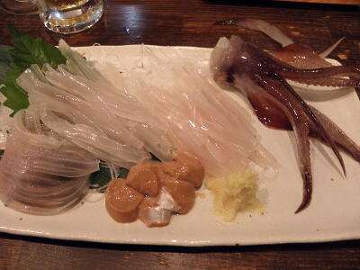 今回はもともと札幌2泊3日を予定していたが、行きの便が取れなかったり3連休の最後の新日本両国大会にゴールデンラヴァーズが出るわで予定大きく変更。夕方から北海道へ。観戦記を書けるとこまで書いて、途中のファイルをノートPCに入れて出発。なので今回はiPadはなし。iPadもHTMLエディタあるみたいだけどキーボードがあれじゃあ仕事は遅くなりそうだし。キャンセル待ちで滑り込んだのは夕方の函館行き。着くともう19時。連絡バスで大森町まで行き、歩いて居酒屋「海のがき大将」に。30分ほど待って着席、まずはイカ刺し。1880円。
