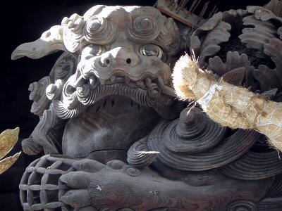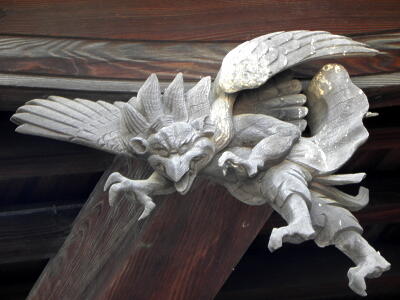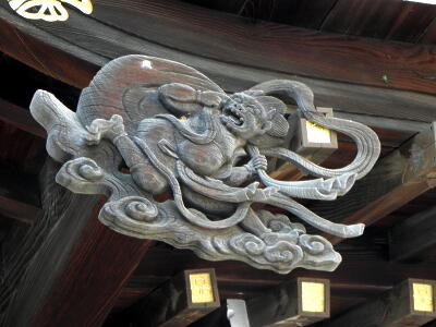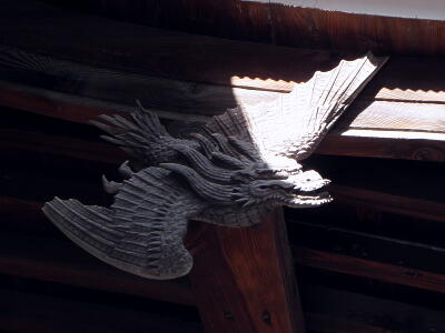 拝殿の飾り。龍の顔を持った鳥。