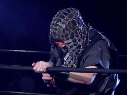そこにHIROKI、タイガーシャーク、ブラックシャドー、ブオ・モチェロ(メビウス)の4人が入ってきて挑戦を表明。望月「お前ら一人も知らない。順番に自己紹介しろ。」そう言われてHIROKI長々と自己紹介(左写真)。