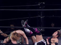 望月は谷嵜の足をロープに引っ掛けて脚攻め(右写真)、コーナーに詰めてキック、望月ロープに飛ぶ、谷嵜逆に望月の足に低空ドロップキック。