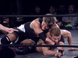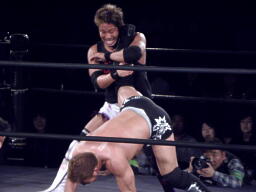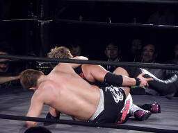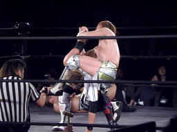 横須賀を背後から谷嵜がスクールボーイ(左写真)、カウント2。谷嵜逆さ押さえ込み、カウント2。15分経過。