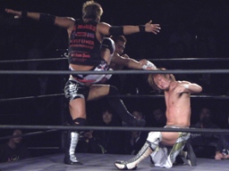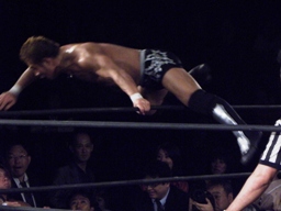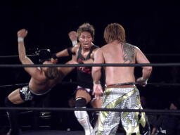 谷嵜、普段は「なおき」だった気もするが、試合前ビデオでは「谷嵜直樹」になっていた。百田コミッショナーの認定宣言の後試合開始。3人で手四つ、ブレークして望月が谷嵜にソバット、谷嵜場外エスケープ。望月と横須賀の2人でロープワーク、横須賀ショルダーブロック、望月ソバット。エプロンに出てチョップとエルボーの打ち合い、戻ってきた谷嵜がエプロンの2人にドロップキック(右写真)、場外に落とす。