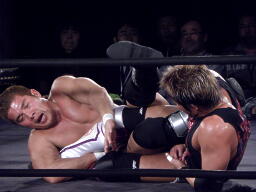 望月谷嵜にアキレス腱固め(左写真)、谷嵜はもう片方の足で蹴って脱出しようとするが望月はその足も捕えてクロスヒールホールドに、谷嵜ロープ。