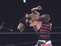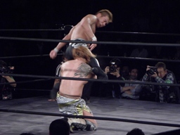 望月ツイスター狙うが横須賀着地、コーナーに振る、望月切り返して串刺しニーアタック、横須賀かわしてパワーボムに(右写真)、エビ固めの応酬に。