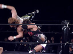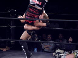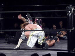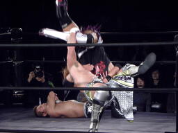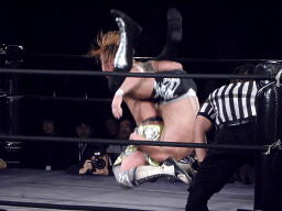 横須賀雪崩式デスバレーボム(右写真)、カウント2。横須賀夢限狙うが谷嵜ブロックしてカサノヴァ、カウント2。横須賀は場外エスケープ。