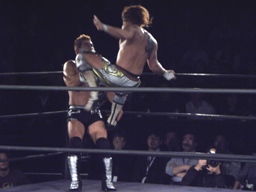 横須賀が望月をコーナーに振る、望月飛び乗って三角飛び延髄蹴り(右写真)、