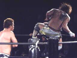息を切らしたカブキ(左写真)、マイクを取ると「疲れちった。」そして「天龍が元気にやってるのを見ると自分もまた出来るんじゃないかなあとか思いますが」(観客沸く)「たぶん無理でしょう。」