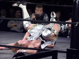 横須賀谷嵜をコーナーに振って串刺しジャンボの勝ち!横須賀ロープに振る、谷嵜ドロップキック、さらにフライングネックブリーカードロップ、足決めフィッシャーマンバスター(右写真)、カウント2。