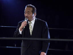 百田コミッショナーが次期大会での挑戦者決定戦をアナウンス(左写真)。最後は望月が「WARファンの皆さん、お久しぶりです。IJ王座が復活するなら獲るのはこの俺だろうと思ってました。次誰が挑戦してくるかわかりませんが、誰の挑戦でも受けます。天龍プロジェクトにまた参戦させていただきます。」と締める。