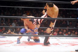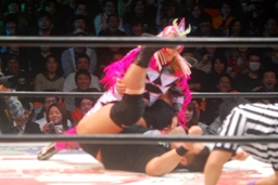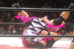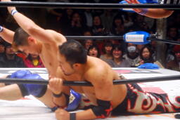 貴ボディスラム、TAKA着地すると再度コーナーに振ってスーパーK(左写真)。