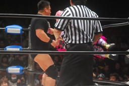 コーナーでファイヤー!ポーズやってる高木を引きずり落としてスクールボーイ(右写真)、カウント2。