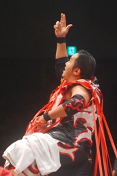 TAKAのキックをかわして右腕、TAKAキャッチしてジャストフェイスロック(左写真)、貴ロープ。残り時間30秒。