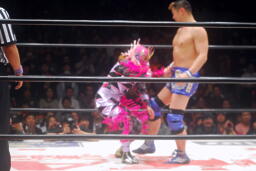コーナーに振ってヒザ蹴り(右写真)、カウント2。