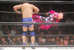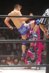 ボリショイエルボー連打(右写真)、TAKAはトラースキック、カウント2。