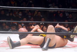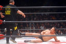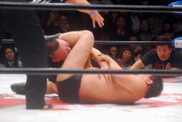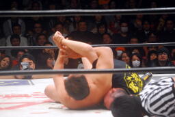 ヘッドシザーズから腕取って十字に(右写真)、しかし小鹿粘ってタイムアップ。