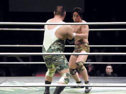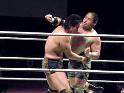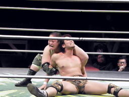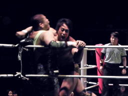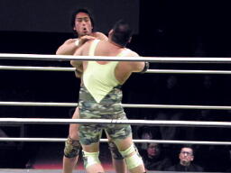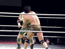 ロックアップ、鎌田がロープに詰める、ブレーク。再度ロックアップ、入江がヘッドロック、鎌田ロープに振る、ショルダーブロックの打ち合い(左写真)。