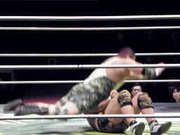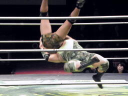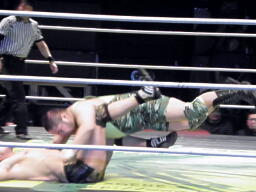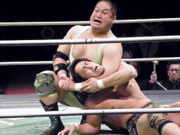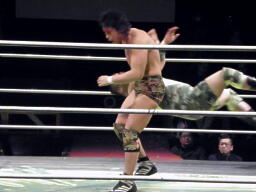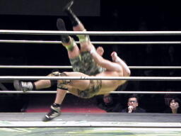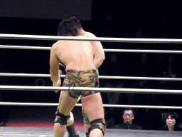 鎌田バックドロップ、入江ブロックしてラリアット、鎌田かわしてバックドロップ(左写真)、カウント2。
