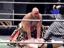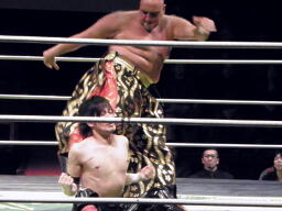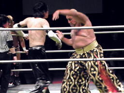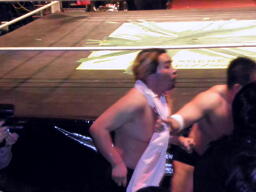 イサミと星誕期乱闘(左写真)。セコンドが一斉に止める。