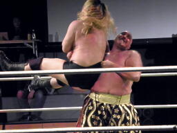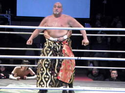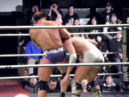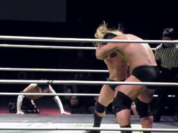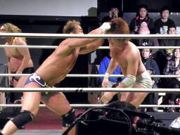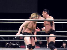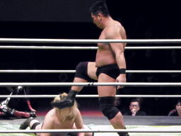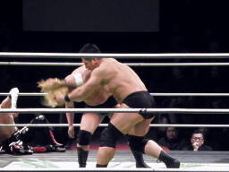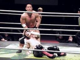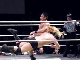 諸橋バック取る、星誕期微動だにせず(左写真)。大家が入るが星誕期はラリアットで返り討ち。高木にタッチ。