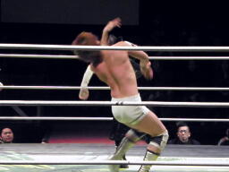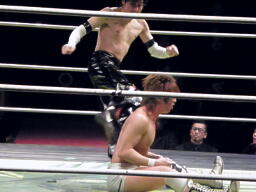 高尾コーナーに上ってマッドスプラッシュ(右写真)、イサミヒザでブロック。