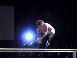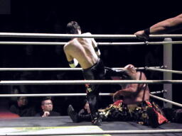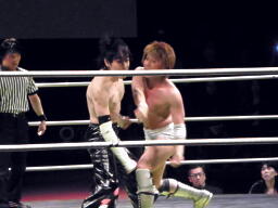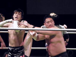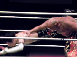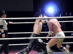 イサミ星誕期の頭をターンバックルにぶつけキック連打(右写真)、コーナーに連れ帰り諸橋にタッチ。