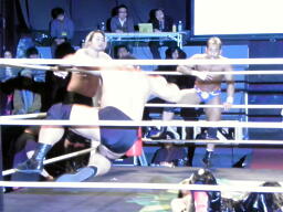 大家がボディスラム、イサミコーナーに上ってダイビングダブルニードロップ(右写真)、星誕期カット。イサミは諸橋にタッチ。