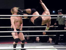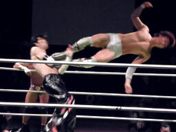 高尾ダイビングギロチンドロップ。ロープに振ってドロップキック(右写真)、カウント2。コーナーに押し込んで星誕期にタッチ。5分経過。