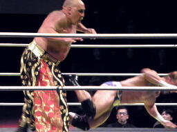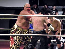 星誕期イサミに首投げからサッカーボールキック(右写真)。ボディスラムからストンピング、高木にタッチ。星誕期と高木ダブルのショルダーブロック。