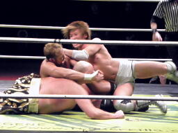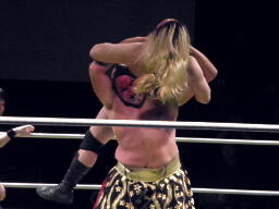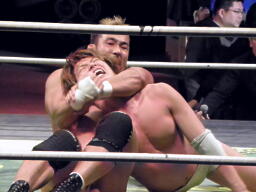 高尾エルボー、諸橋かわしてクリップラークロスフェース(右写真)、高木カット。イサミと星誕期にタッチ。10分経過。