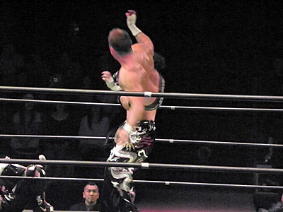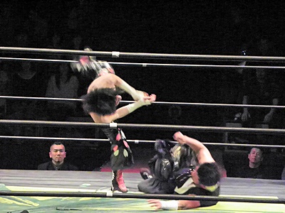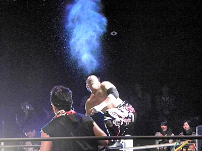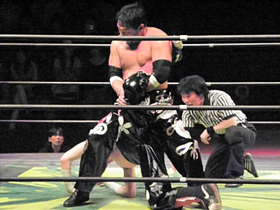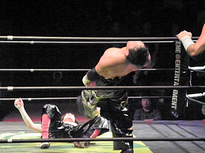 イサミキャッチ延髄、ボディスラムからダイビングニードロップ狙ってコーナーに上る、大原が阻止(左写真)。TAJIRIコーナーに上る、イサミ突き落としてダイビングダブルニードロップ、TAJIRIかわす。