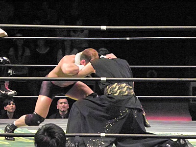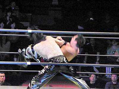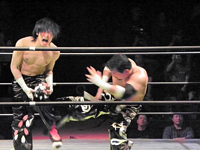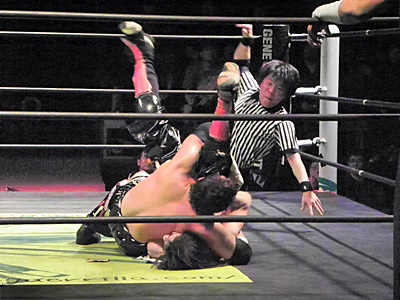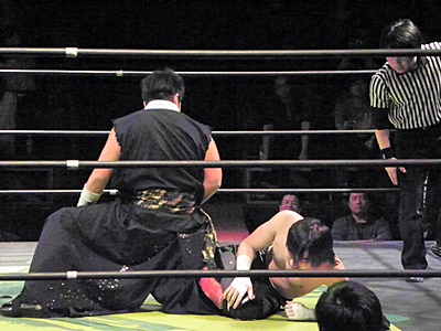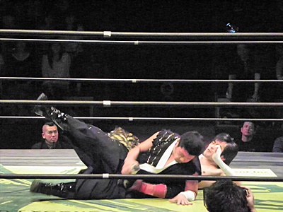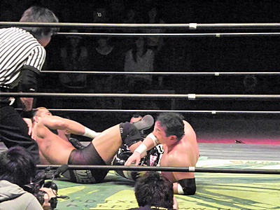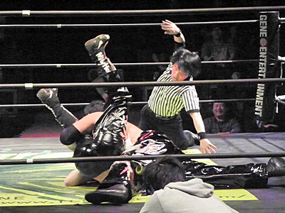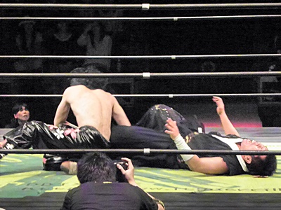 TAJIRIしつこく何回もカバー(右写真)、イサミ2でキックアウト。