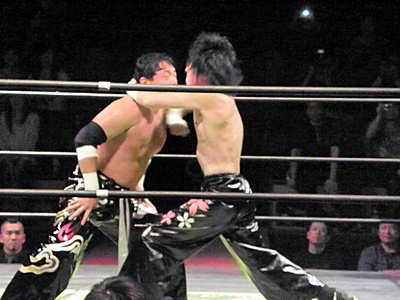 イサミミサイルキック、TAJIRIコーナーまで吹っ飛んで大原にタッチ。エルボー打ち合い(右写真)。10分経過。