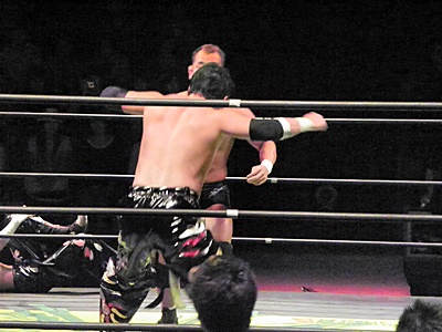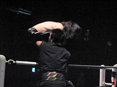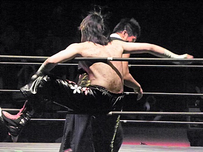 TAJIRI諸橋にトラースキック、諸橋リング下に転落ししばし戦線離脱。イサミはTAJIRIにエルボー(右写真)、ロープに振る、TAJIRIハンドスプリングエルボー、カウント2。