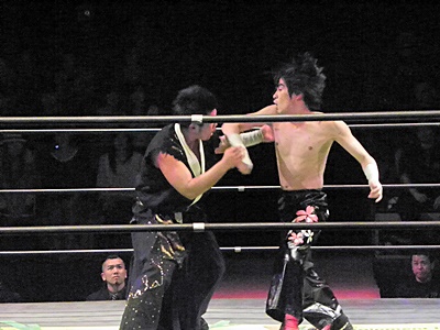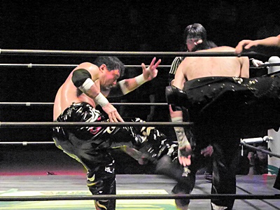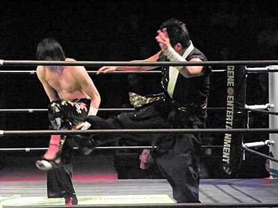 TAJIRIローキックでイサミにヒザを着かせるとバズソーキック(右写真)、カウント3。