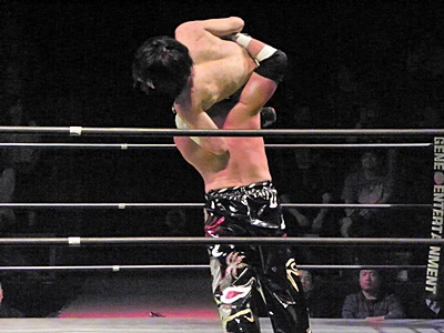 大原TAJIRIの指示でボディスラム3連発(左写真)、TAJIRIとタッチ。