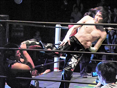 イサミロープに飛ぶ、大原カウンターの低空ドロップキック(右写真)、TAJIRIにタッチ。