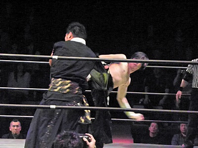 ロープに振ってバックエルボー(左写真)、カウント2。TAJIRIガットショット、ロープに飛ぶ、イサミドロップキック。イサミロープに飛ぶ、大原がエプロンからキック。