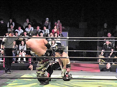 大原キック、イサミキャッチしてエルボードロップ落とす(右写真)。イサミ助走付けてトランスレイヴ、カウント2。