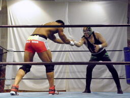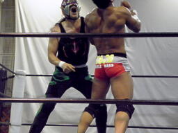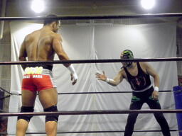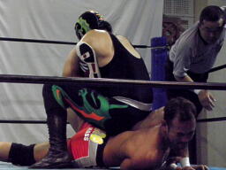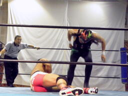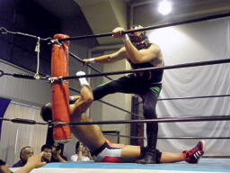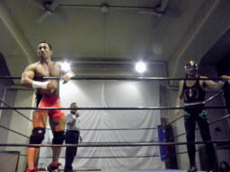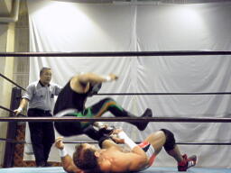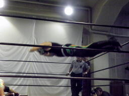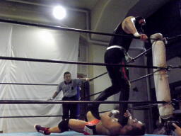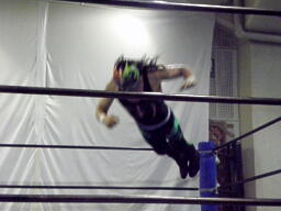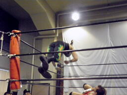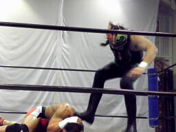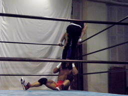 サムライは足にストンピング、ボディスラム、コーナーに上ってダイビングヘッドバット(右写真)、これは諸橋かわす。しかし諸橋も立ち上がれない。