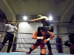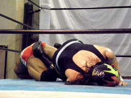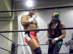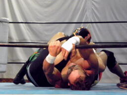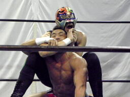 諸橋クォーラルボンバー、サムライかわしてリバースDDTの体勢、諸橋切り返してクリップラー・クロスフェース(右写真)、サムライロープ。