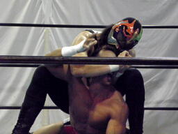 ロープでチョーク(右写真)。また鼻をつまんでパンチ、鼻にエルボースタッブ。
