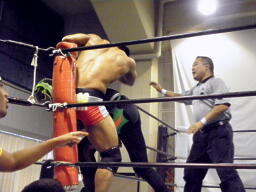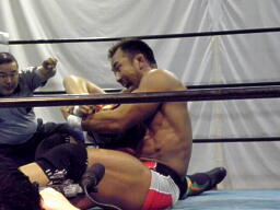 サムライは諸橋の顔面を2度ターンバックルにぶつけ、ダウンした諸橋の両肩に乗る(右写真)。